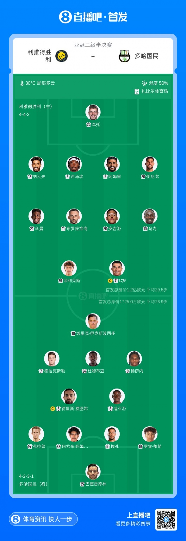 利雅得胜利首发:24-本托、26-伊尼戈·马丁内斯、5-阿姆里、3-西马坎、12-纳瓦夫、11-布罗佐维奇、20-安吉洛、79-菲利克斯、10-马内、21-科曼、7-C罗